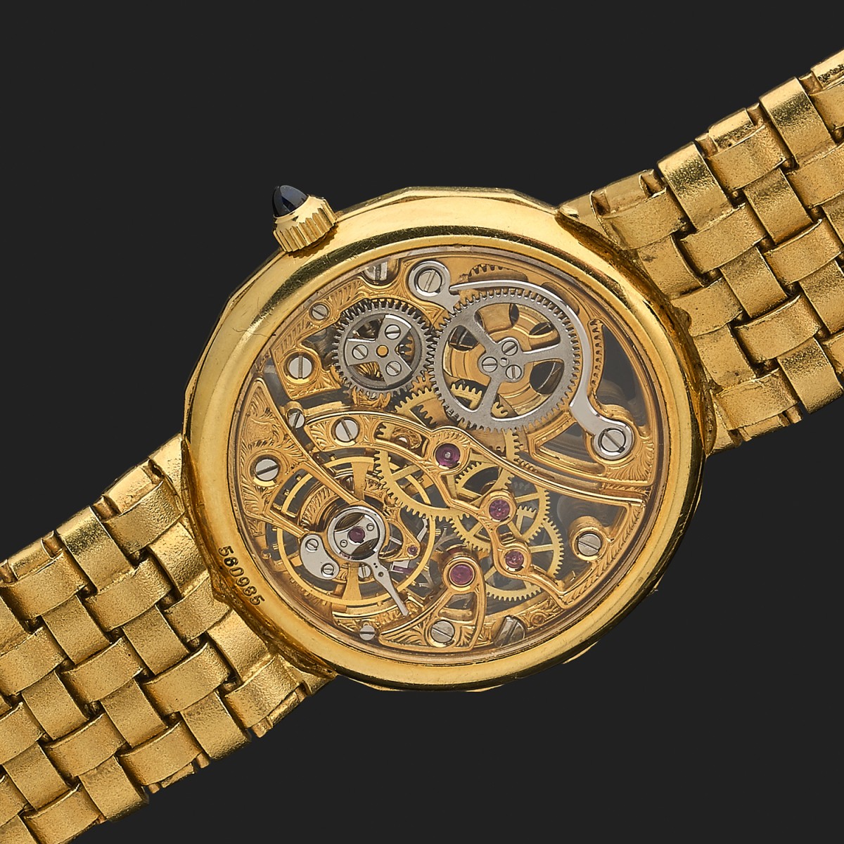 Montre bracelet de femme en or jaune, cadran et fond squelette dévoilant son mouvement mécanique, lunette ornée de diamants. Bracelet or jaune, maillons ciselés articulés avec fermoir à cliquet en or jaune. Signée et numérotée 560985.