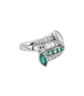 Bague toi et moi en platine, ornée d’un diamant et d’une émeraude taille navette, épaulés de diamants et émeraudes ronds et carrés.