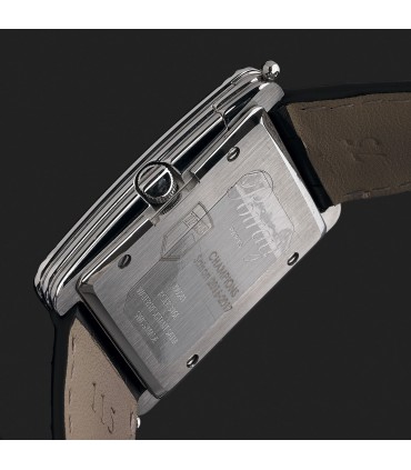 Montre bracelet en acier, cadran noir rainuré avec chiffres romains. Mouvement quartz. Bracelet en crocodile avec boucle ardillon en acier. Signée et numérotée 100541.