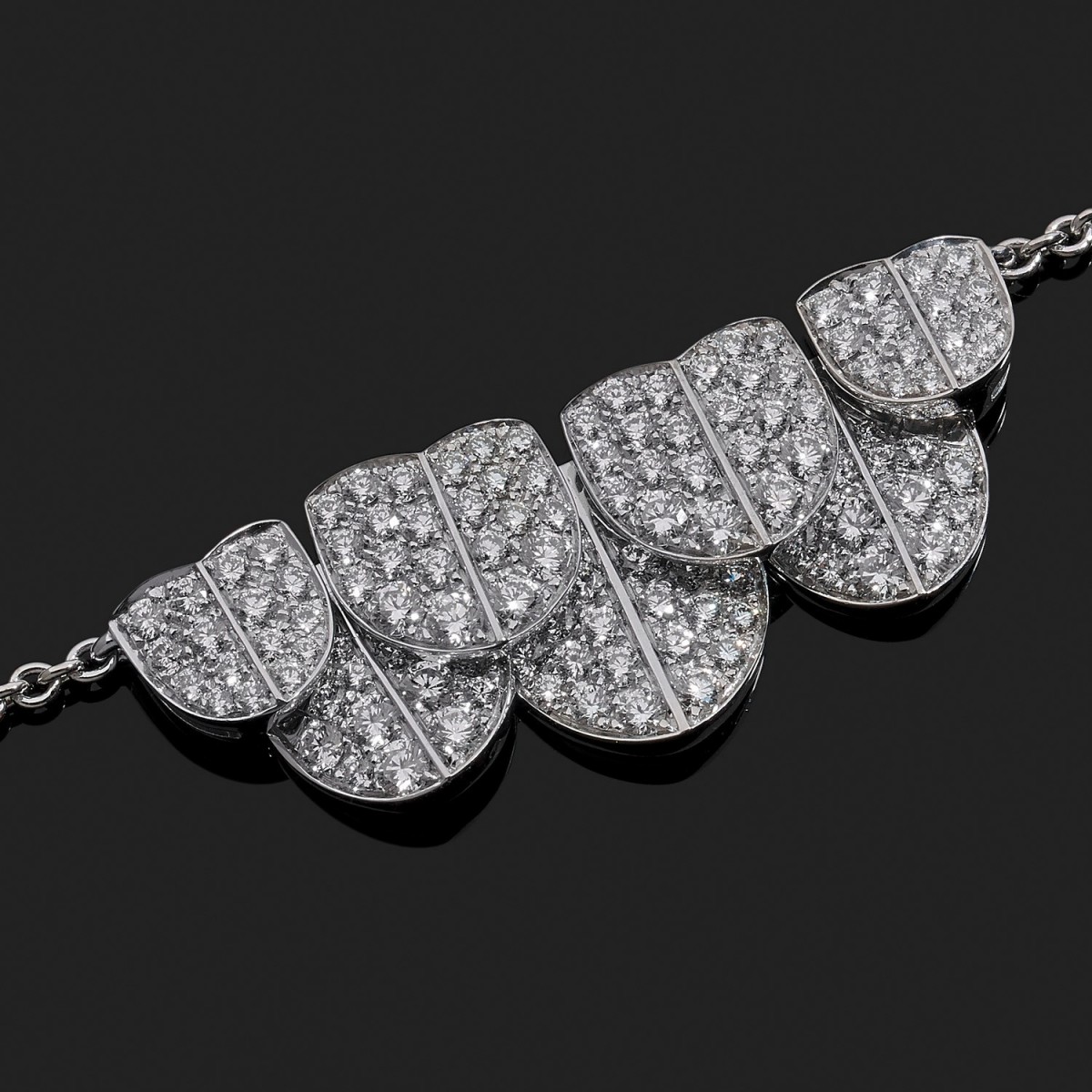Collier en or blanc, maille forçat, centré d’un motif en chute articulé à décor de palmettes pavés de diamants. Signé et numéroté 1007499.