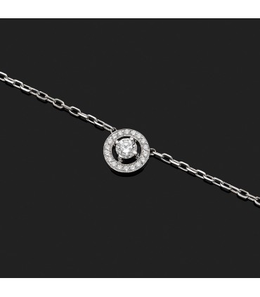 Collier en or blanc, maille forçat, centré d’un motif rond ajouré orné d’un diamant de 0,25 ct env. dans un entourage de diamants. Signé et numéroté C0718791.