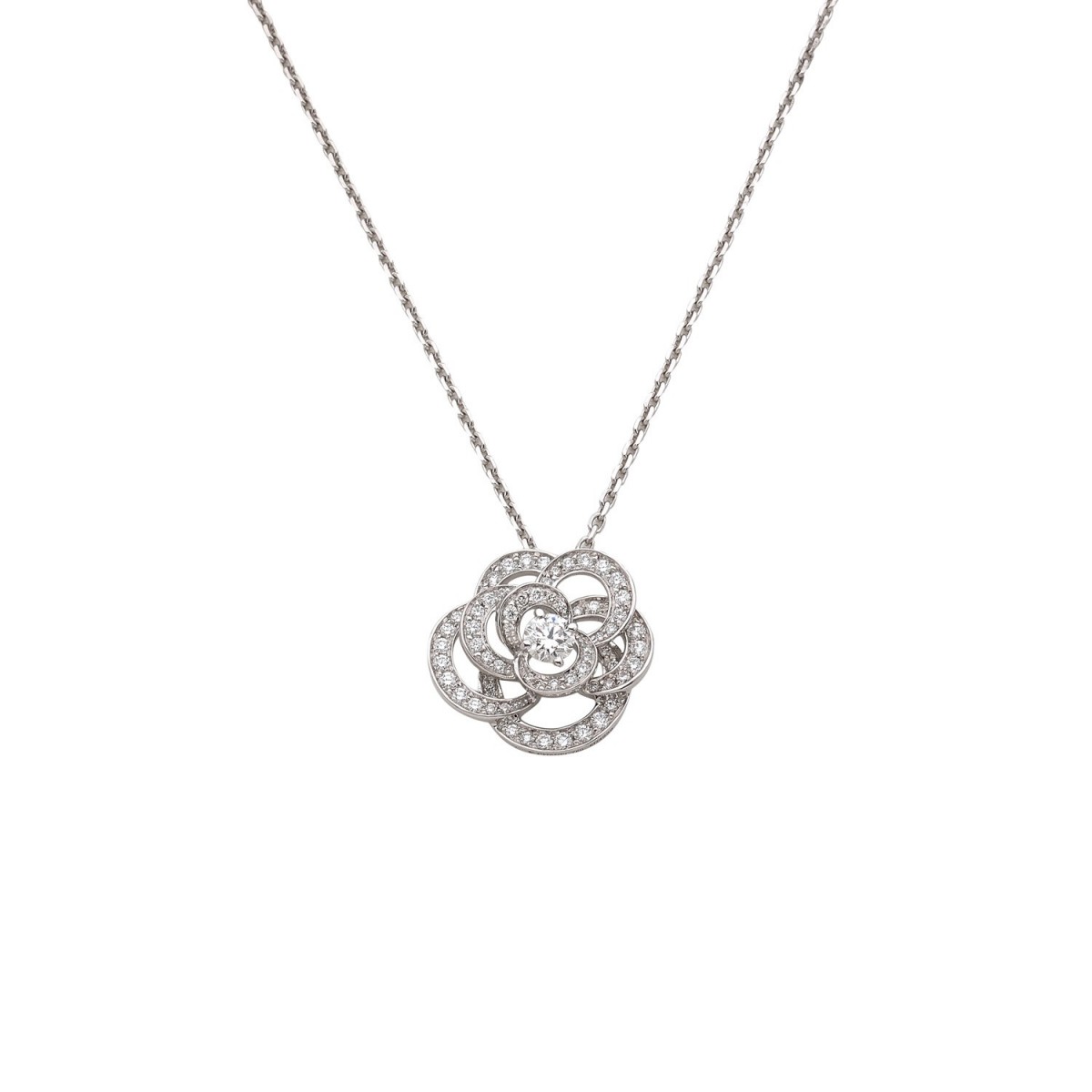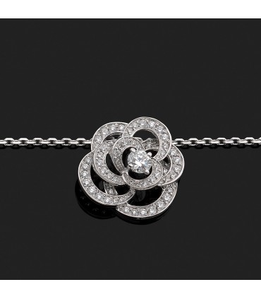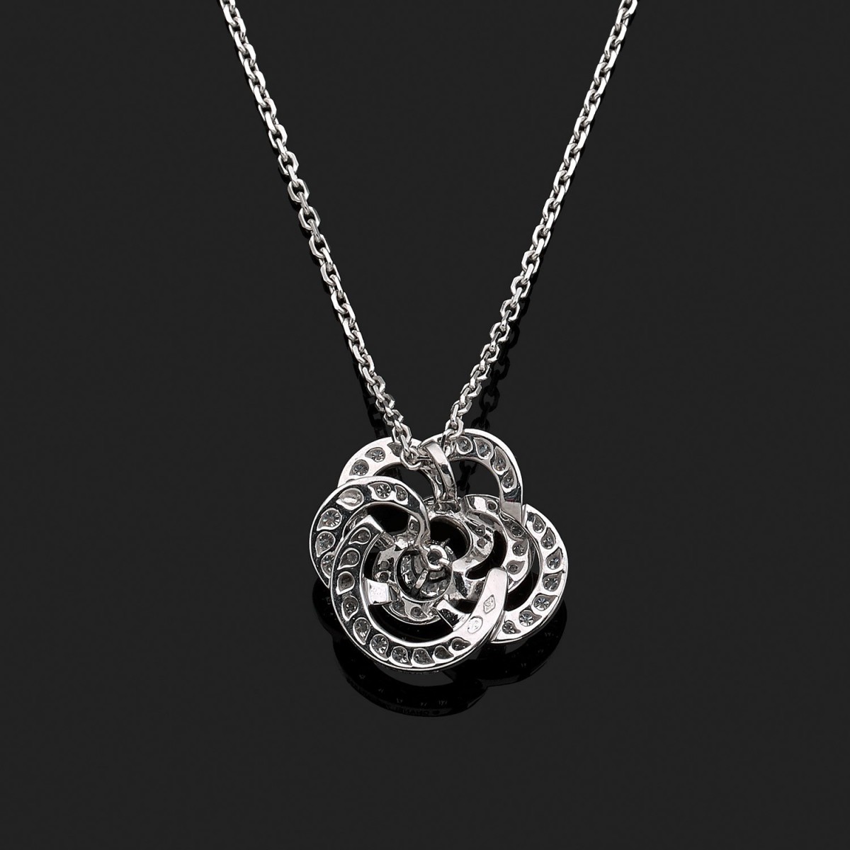 Chaîne pendentif en or blanc, maille forçat retenant un motif ajouré stylisant un camélia centré d’un diamant de 0,30 ct dans un pavage de diamants. Signée et numérotée.