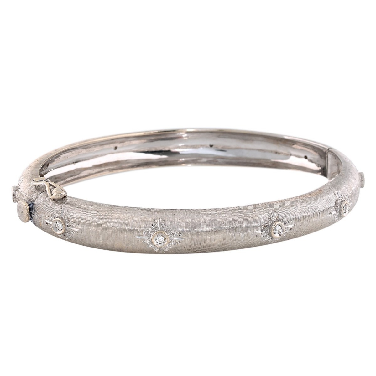 Bracelet jonc rigide ouvrant en or blanc guilloché, ponctué de diamants dans un décor floral, agrémenté d’un fermoir à cliquet avec sécurité.