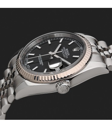 Montre bracelet en acier, cadran noir avec index appliqués, affichage de la date par guichet à 3 heures, lunette striée en or blanc. Mouvement automatique. Bracelet acier, maillons jubilé avec boucle déployante en acier. Signée et numérotée 116234.
