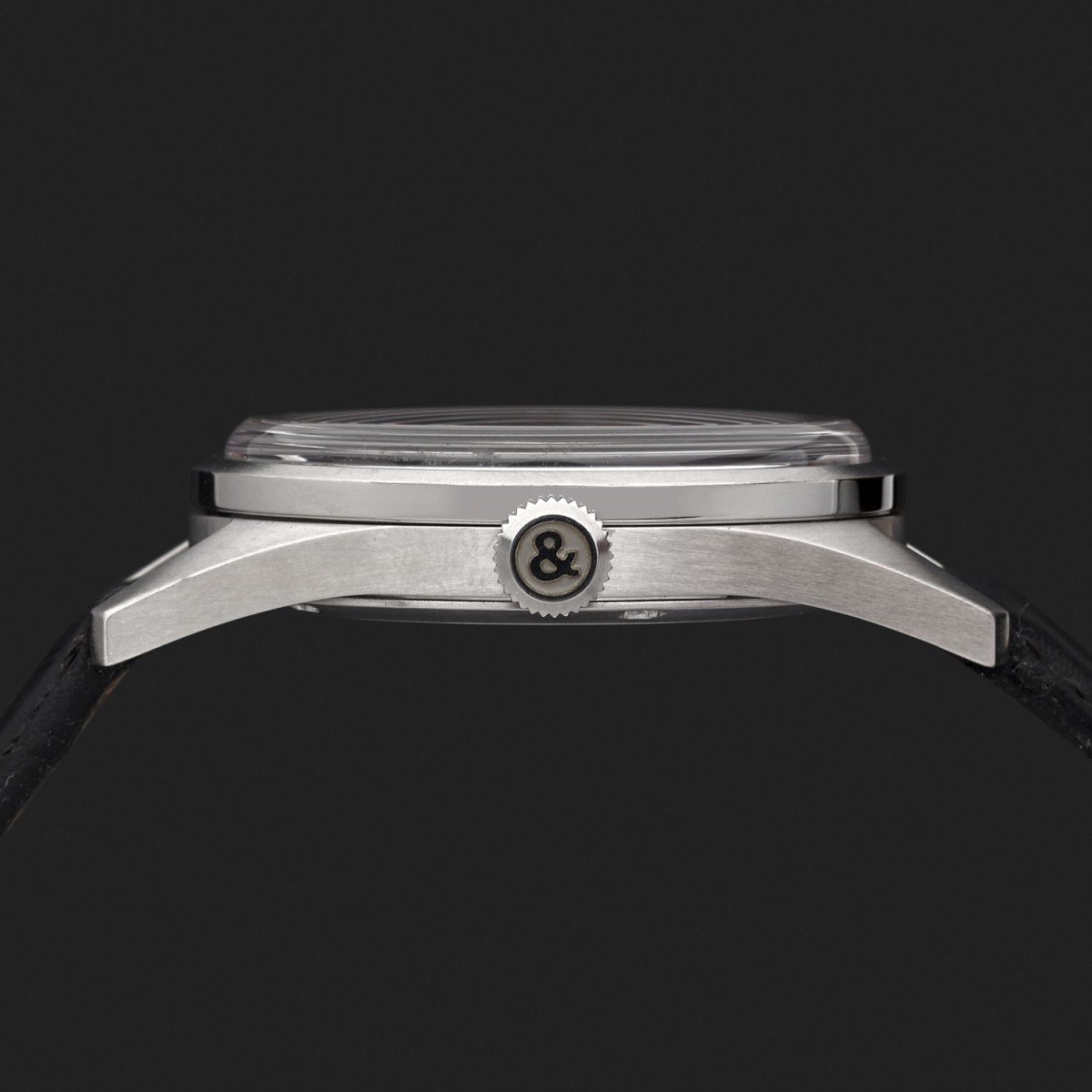 Montre bracelet d’homme en acier, cadran noir avec index et chiffres arabes luminescents, petite trotteuse et date à 6 heures. Mouvement automatique. Bracelet en cuir noir neuf avec boucle déployante réglable en acier. Signée et numérotée.