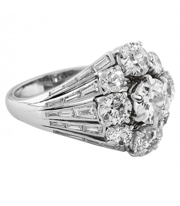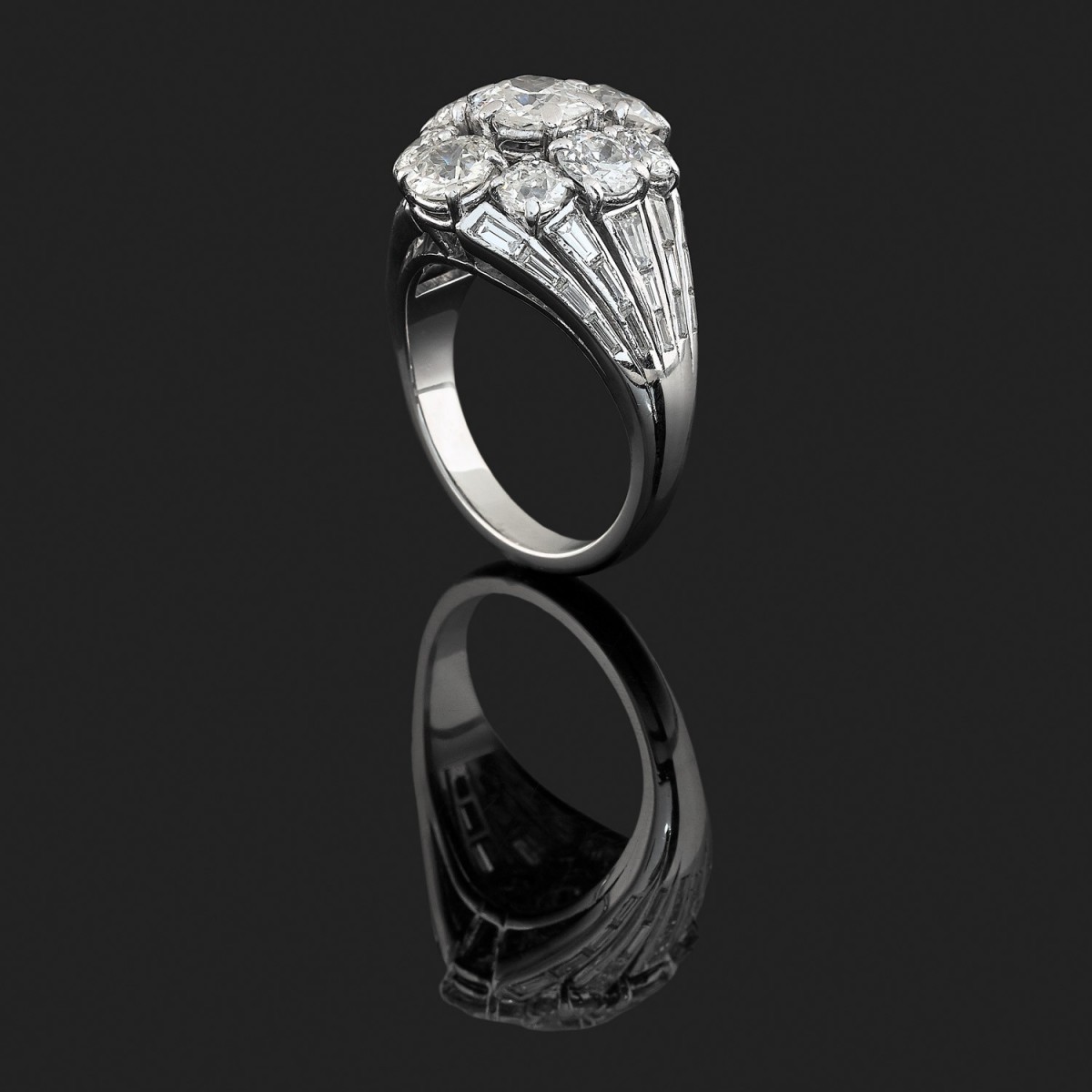 Bague en platine, ornée de diamants taille ancienne en serti griffe, les palmettes rehaussées de diamants taille baguette.