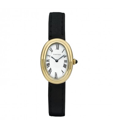 Montre bracelet de femme en or jaune, cadran blanc avec chiffres romains, lunette double godron. Mouvement mécanique. Bracelet crocodile noir avec boucle déployante en or jaune. Signée et numérotée.