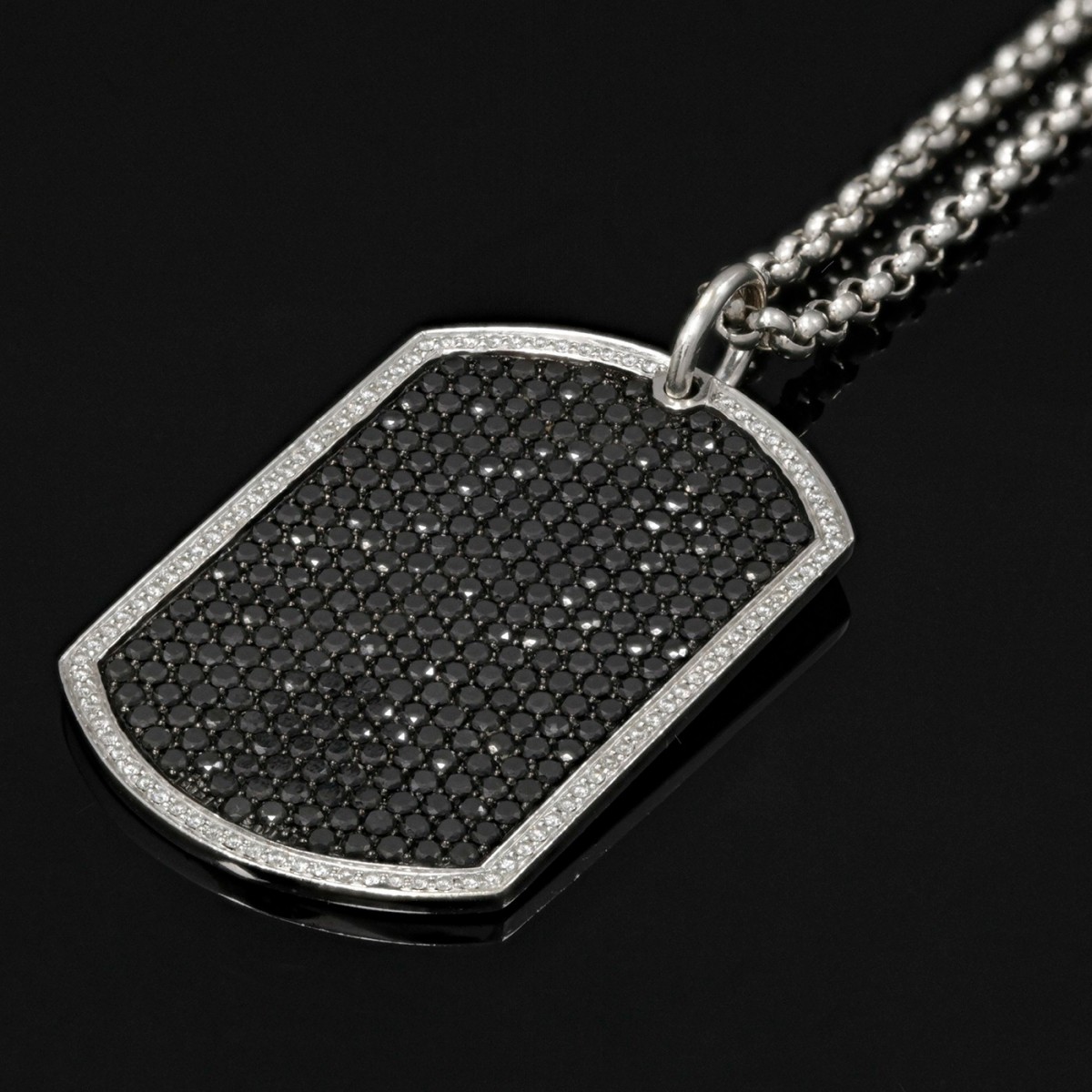 Collier plaque GI MM en or blanc, maille jaseron, ornée d’une plaque pavée de diamants noirs entourés d’un liseré diamanté. Signé.