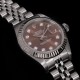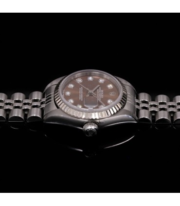 Montre bracelet de femme en acier, cadran marron rayonnant avec index diamants, affichage de la date par guichet à 3 heures, lunette cannelée en or blanc. Mouvement automatique. Bracelet acier, maillons jubilé avec boucle déployante réglable en acier. Signée et numérotée réf 79174.