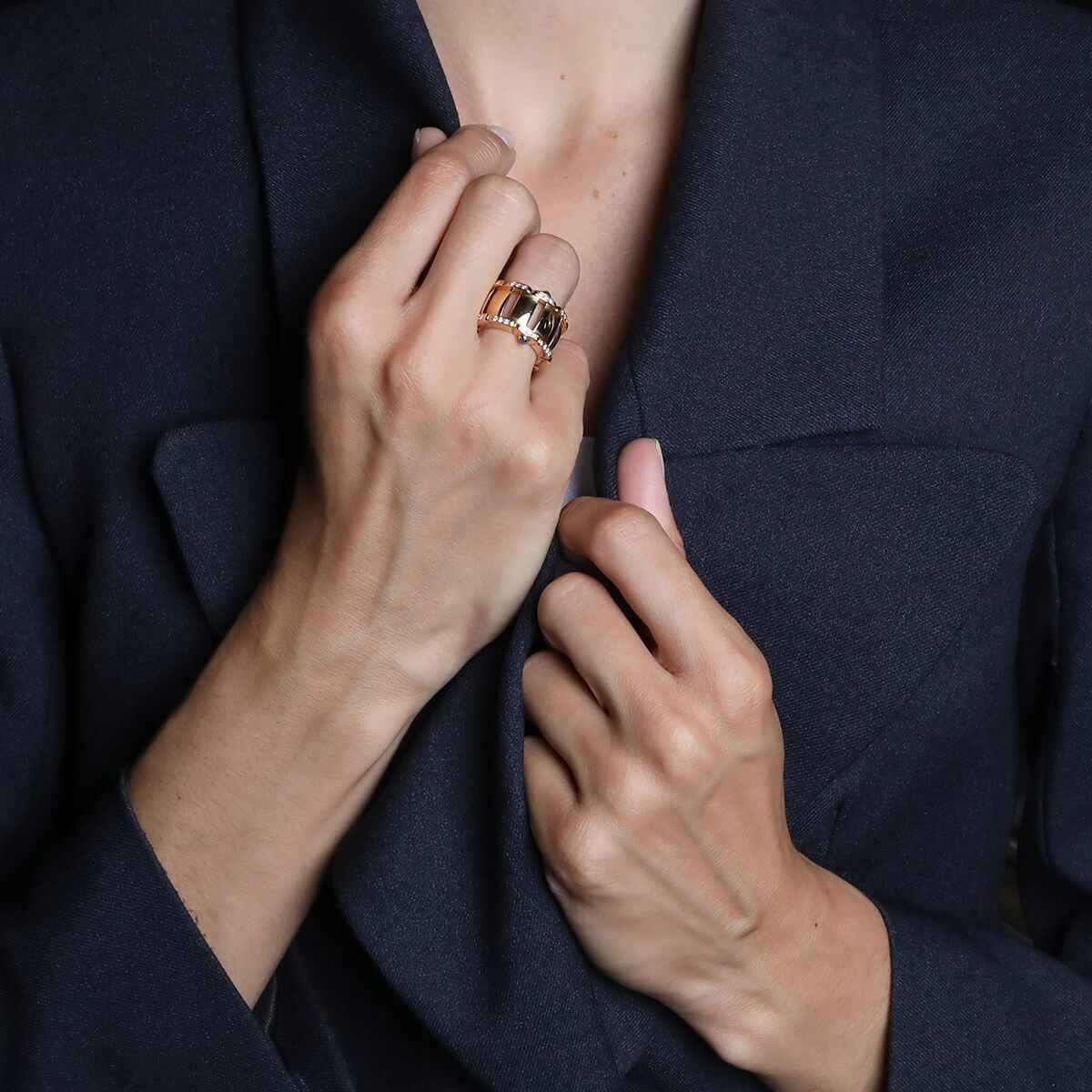 Bague en or jaune, à décor ajouré bordé de lignes de diamants, la tranche ponctuée de saphirs cabochons. Signée.