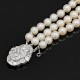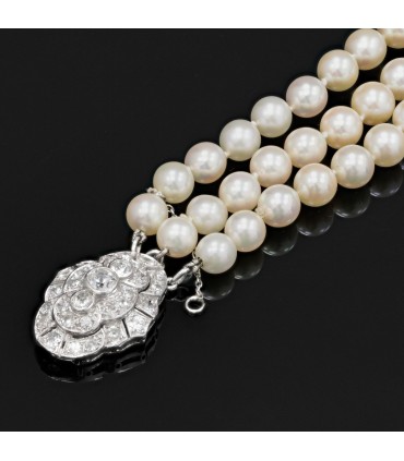 Collier composé de 3 rangs de perles de culture de 6 mm à 9,5 mm, agrémenté d’un fermoir à cliquet en platine, pavé de diamants taille ancienne avec chaînette de sécurité.