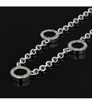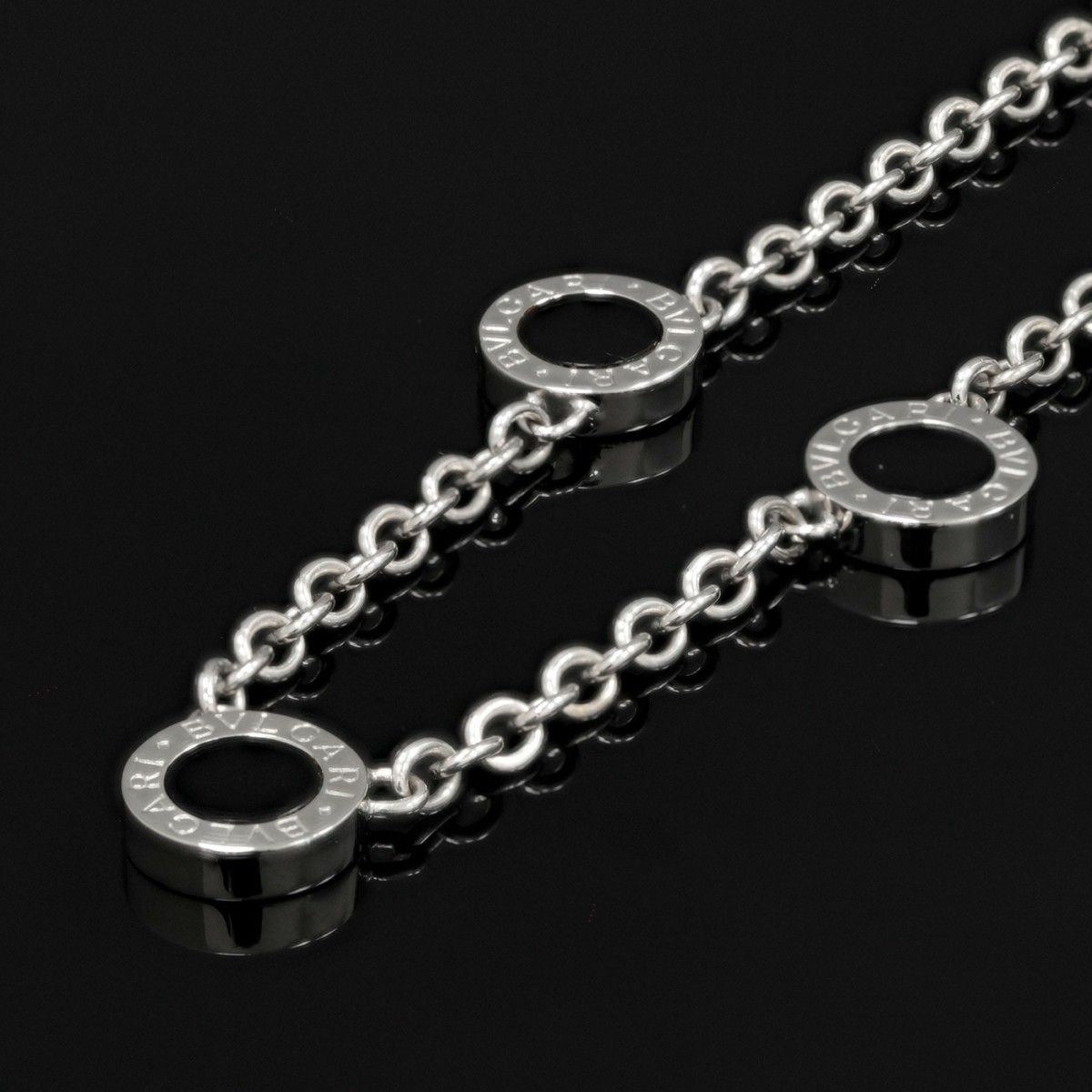Collier en or blanc, maille forçat, centré de 3 motifs gravés “Bvlgari”, une face rehaussée d’un pavage de diamants, l’autre face ornée d’un disque d’onyx. Signé.