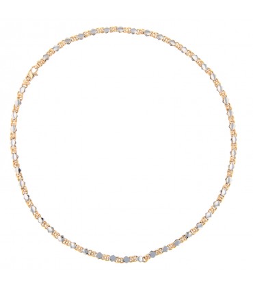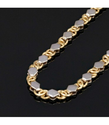 Chaîne 2 tons d’or, composée de maillons à décor géométrique, agrémentée d’un fermoir mousqueton.