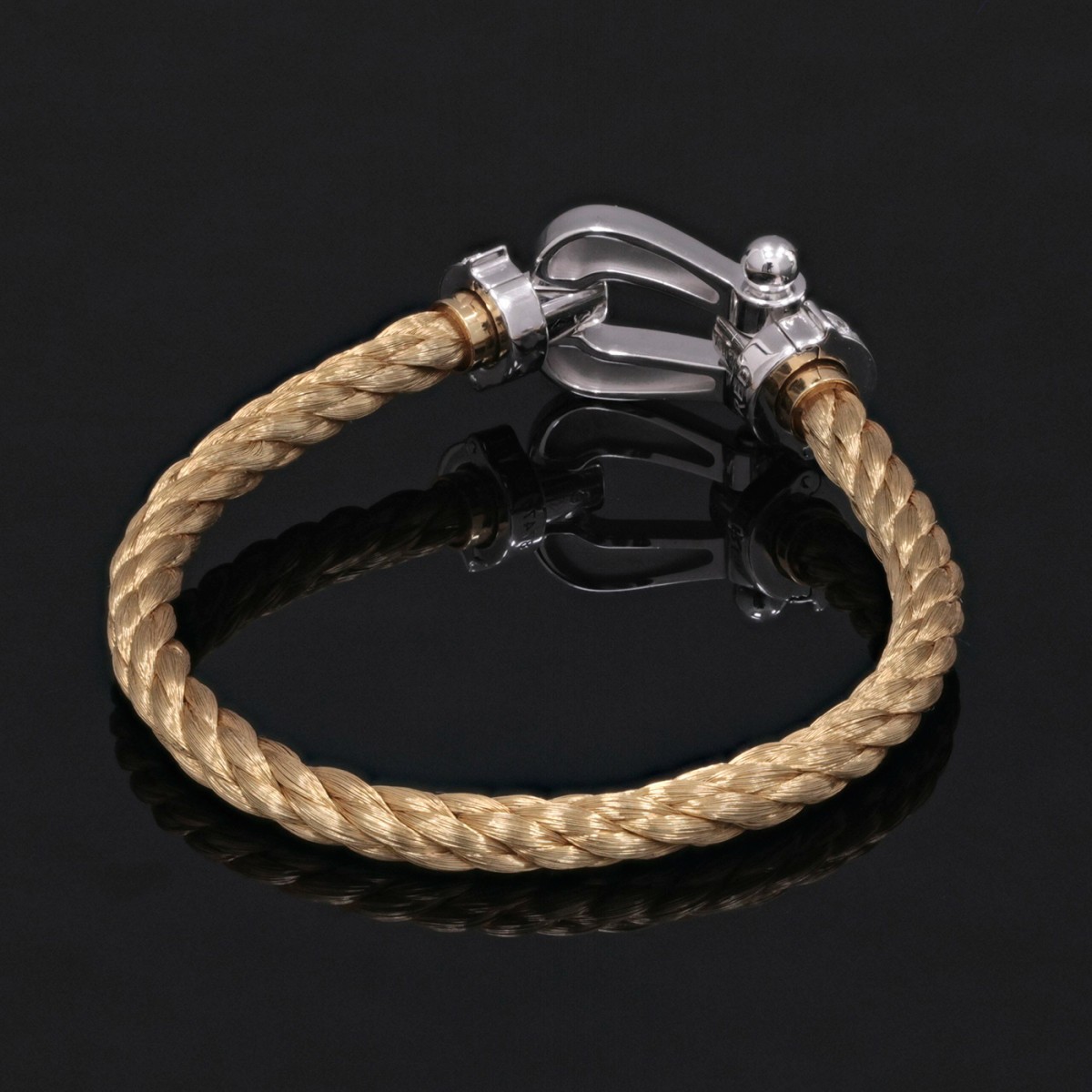 Bracelet grand modèle composé d’un câble en or jaune torsadé agrémenté d’un fermoir en or blanc ajouré stylisant une manille rehaussée d’un pavage de diamants. Signé et numéroté.