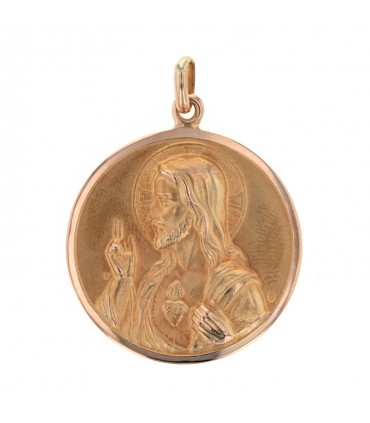 Médaille religieuse en or jaune, stylisant jésus d’un côté et la vierge à l’enfant de l’autre.