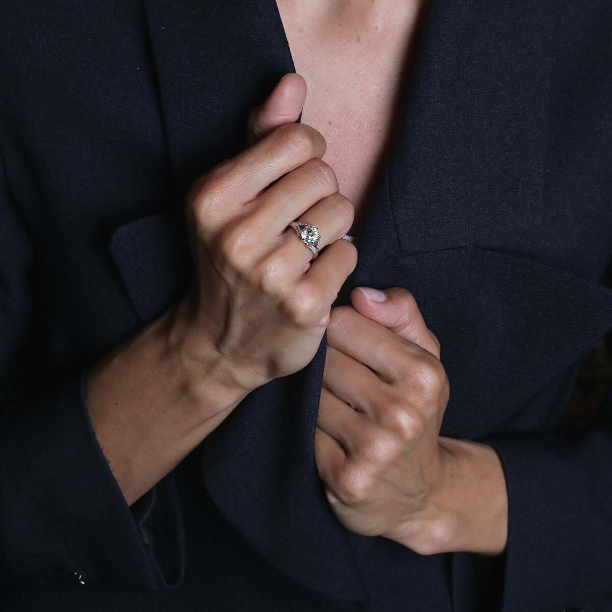 Bague solitaire en platine, ornée d’un diamant coussin taille ancienne de 2,37 ct épaulé de 2 lignes de diamants.