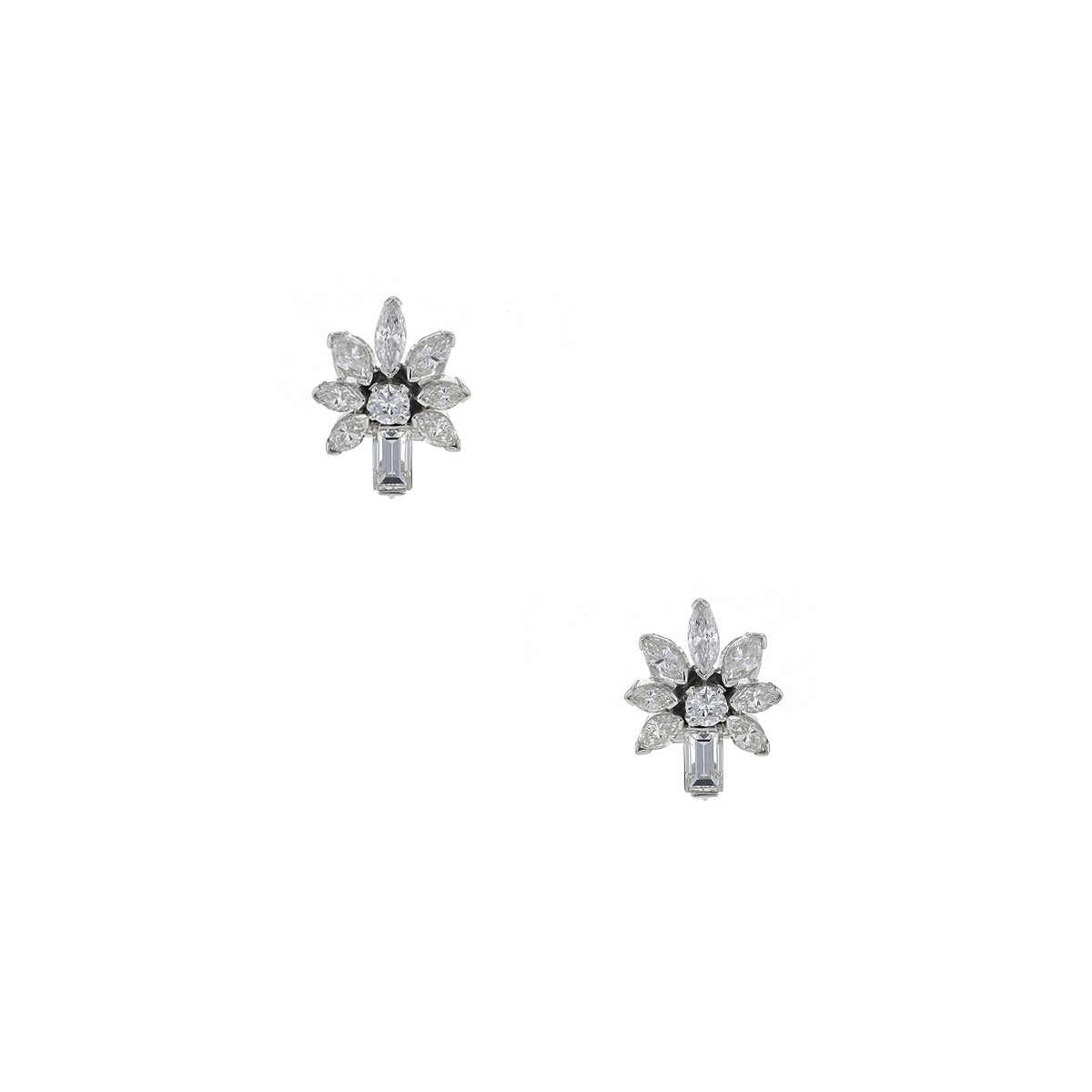 Boucles d’oreilles en or blanc, stylisant une fleur ornée de diamants taille navette, baguette et rond.
