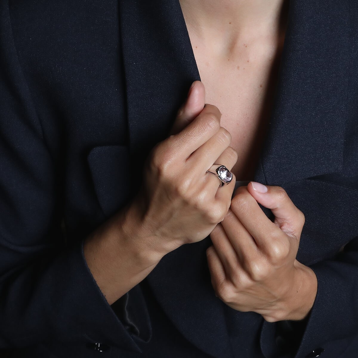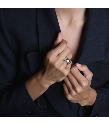 Bague en or blanc, ornée d’une morganite en demi serti clos. Signée et numérotée.