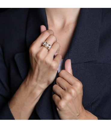Bague en or jaune et platine, ornée d’une perle de culture de 8,5 mm de diamètre épaulée de lignes de diamants en serti or blanc.