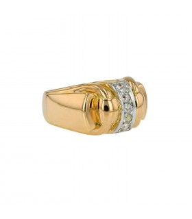 Bague en or jaune, à décor géométrique centré d’une ligne de diamants taille ancienne en serti platine.