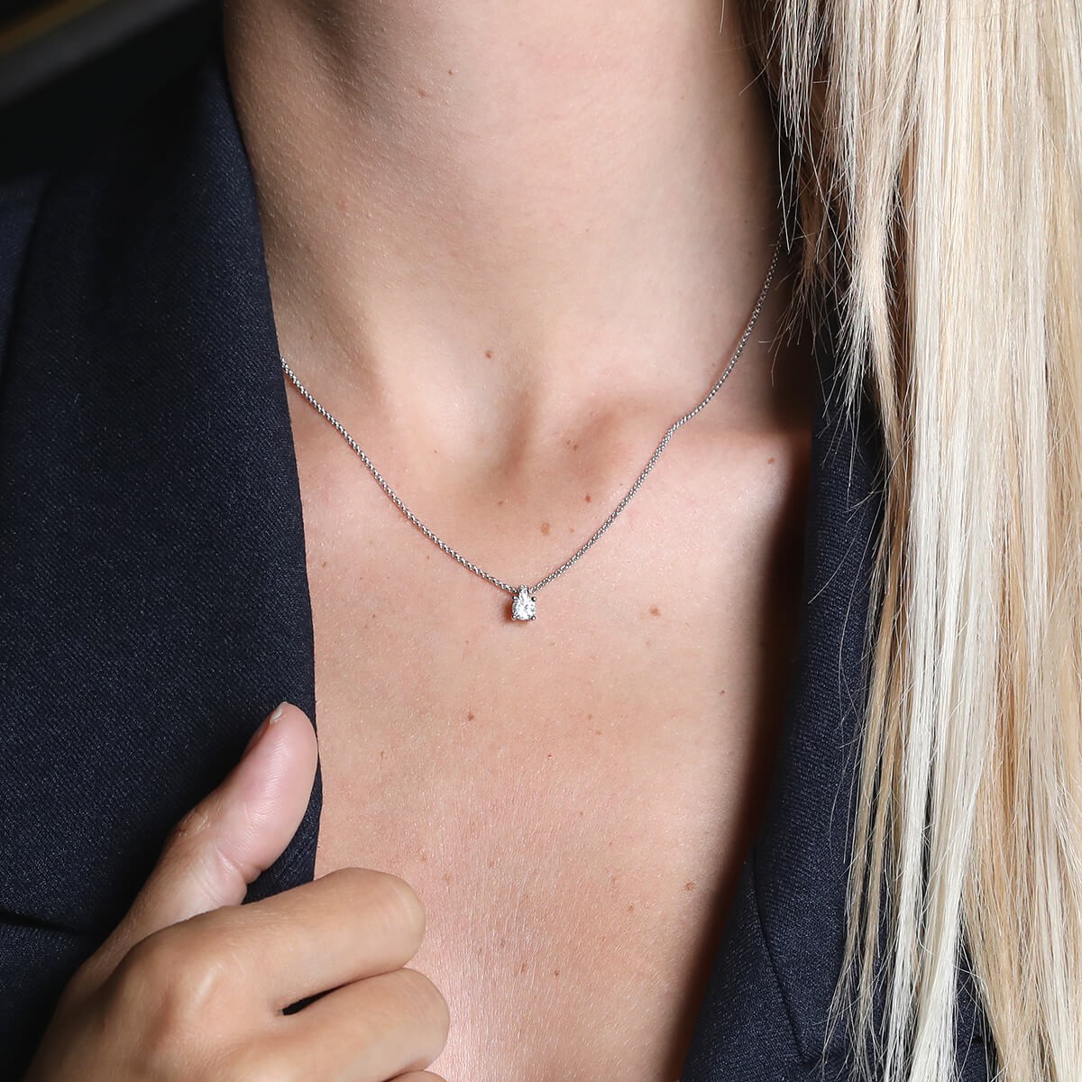 Collier en or blanc, maille jaseron, centré d’un diamant de 0,30 ct en serti griffe, la bélière rehaussée de petits diamants. Signé et numéroté.