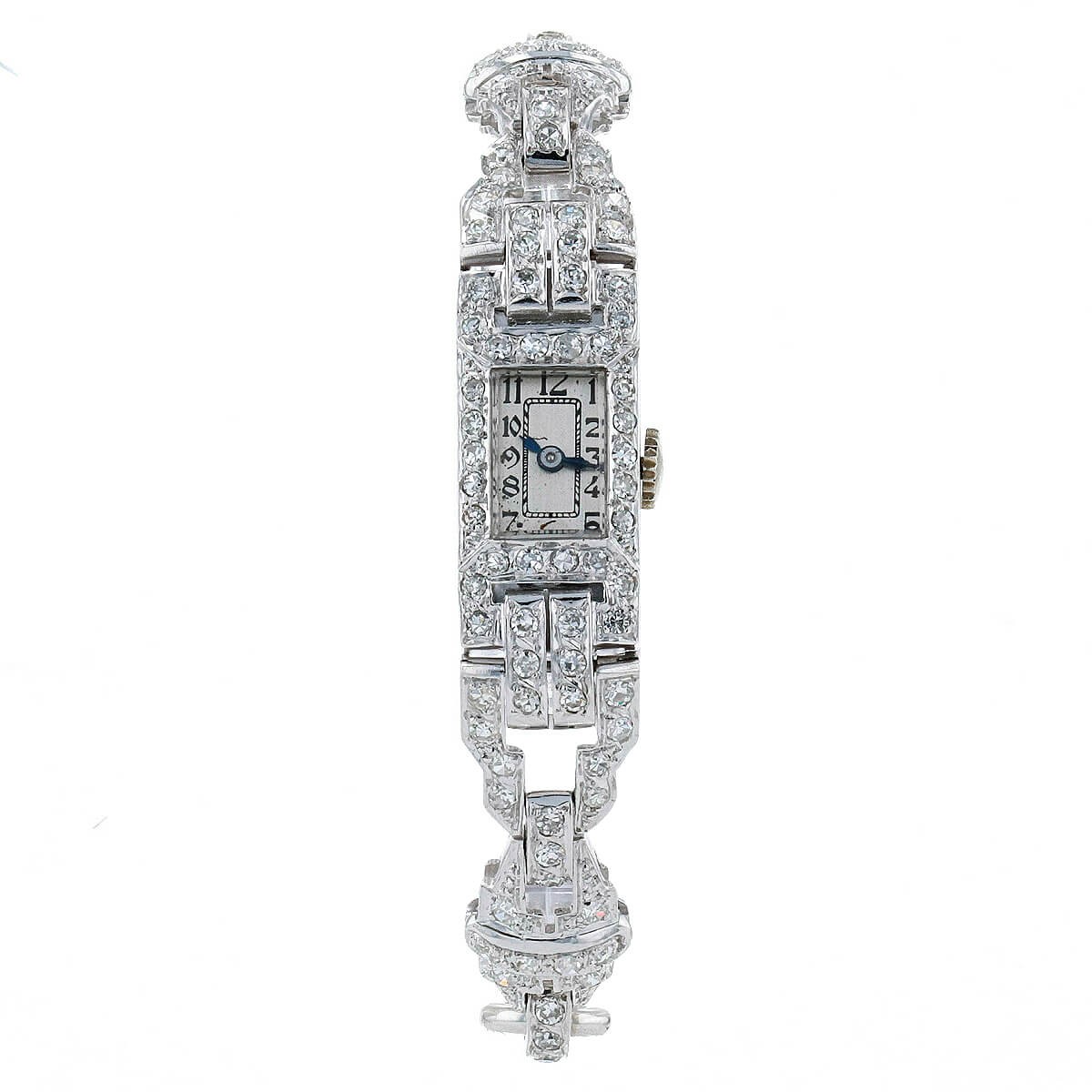 Montre Art Déco en platine, cadran argenté patiné avec chiffres arabes peints, lunette, attaches et bracelet à décor géométrique ajouré ornés de diamants taille 8/8. Mouvement mécanique. Fin de bracelet en or blanc agrémenté d’un fermoir à cliquet.