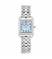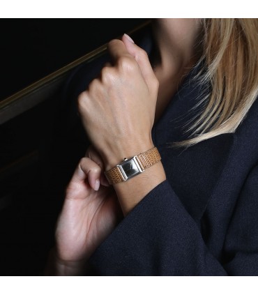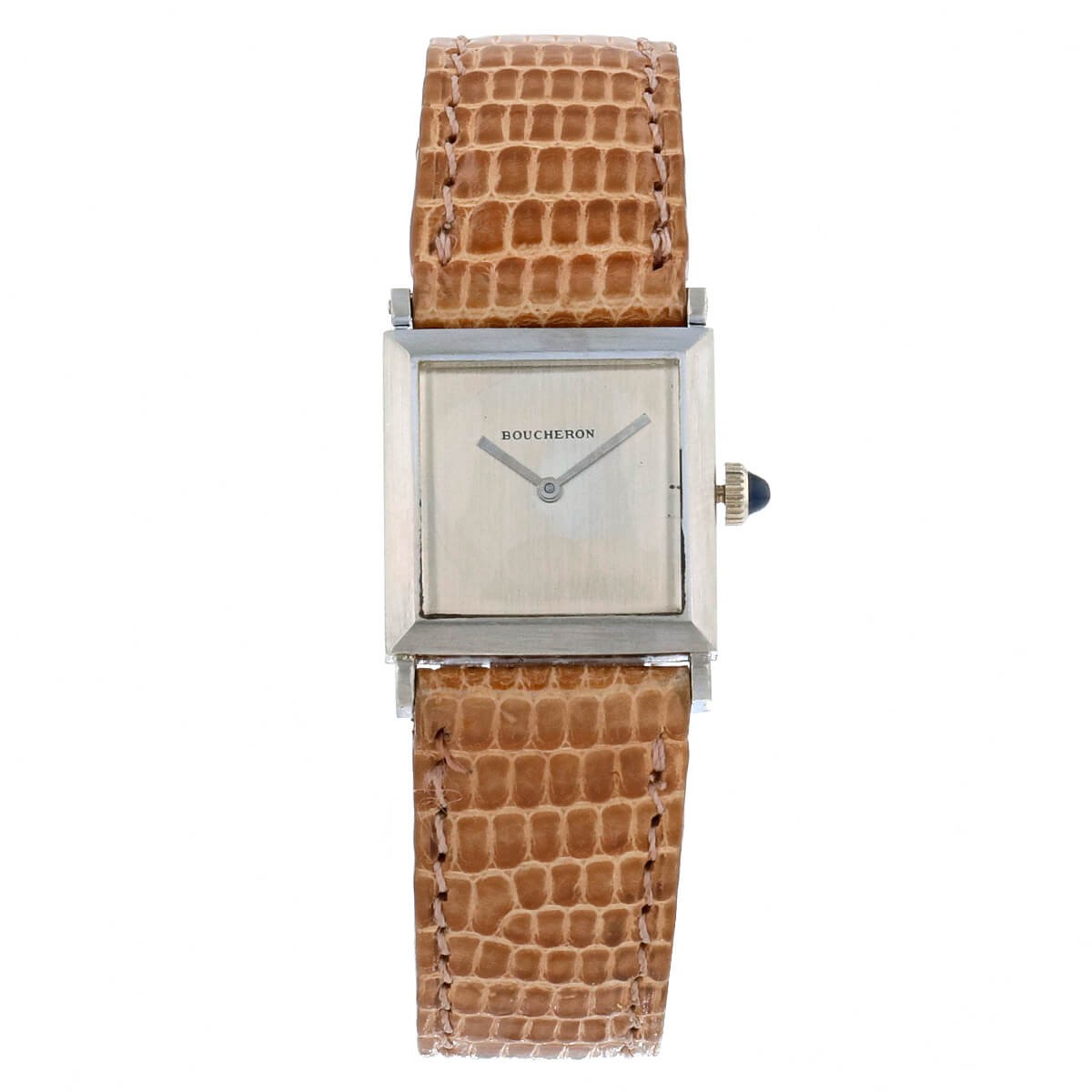 Montre bracelet de femme en or blanc, cadran argenté patiné, lunette carrée à pans. Mouvement mécanique. Bracelet en lézard marron avec fermoir à glissière. Signée et numérotée.