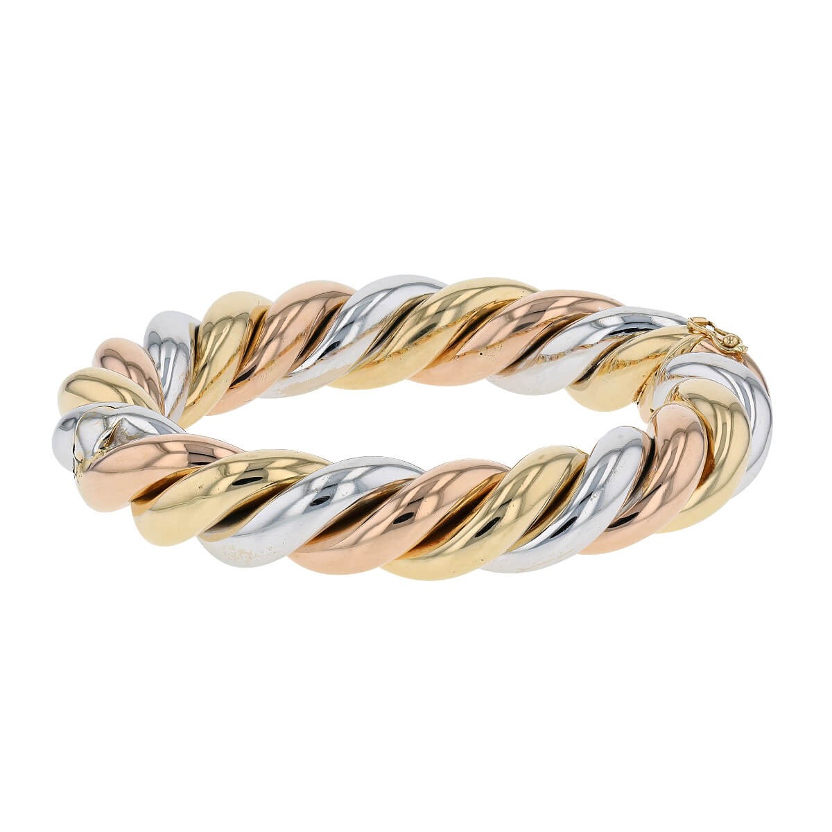 Bracelet jonc rigide ouvrant 3 tons d’or, stylisant une torsade, agrémenté d’un fermoir invisible à cliquet avec sécurité.