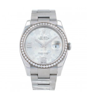 Montre bracelet de femme en acier, cadran argenté stylisé à décor de fleurs avec chiffres arabes appliqués, lunette ornée de diamants. mouvement automatique. Bracelet acier, maillons articulés avec boucles déployante réglable en acier. Signée et numérotée réf. 116244.