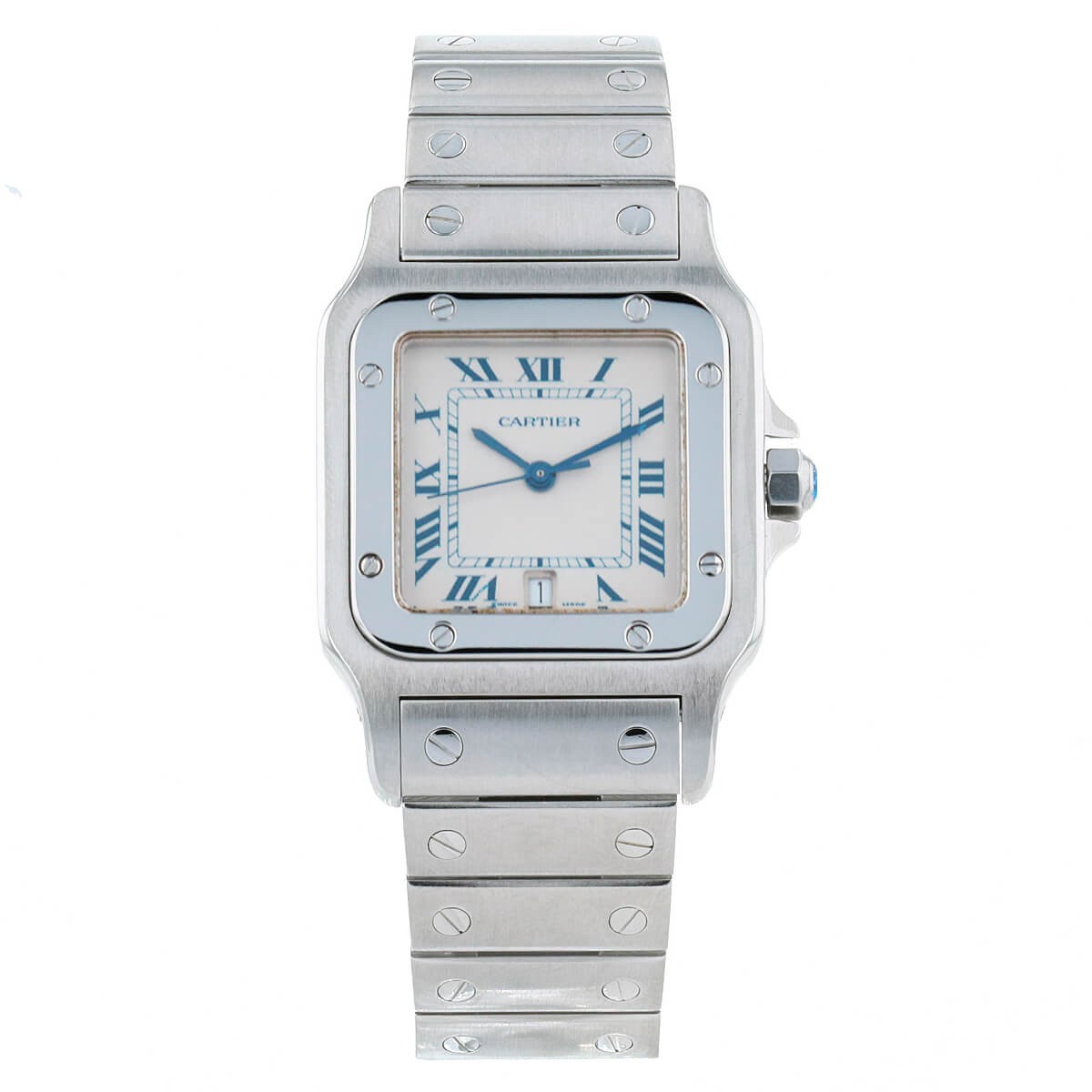 Montre bracelet en acier, cadran argenté avec chiffres romains peints, chemin de fer pour les minutes, affichage de la date par guichet à 6 heures, lunette à décor de vis. Mouvement quartz. Bracelet en acier, maillons articulés avec boucle déployante en acier. Signée et numérotée.