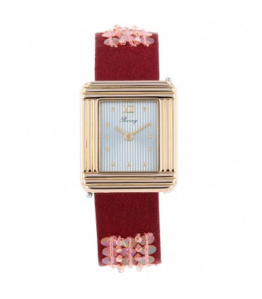 Montre bracelet de femme en or rose et acier, cadran argenté stylisé avec index dorés, lunette godronnée en or rose. Mouvement quartz. Bracelet interchangeable en tissu bordeau rehaussé de paillettes. Signée et numérotée.