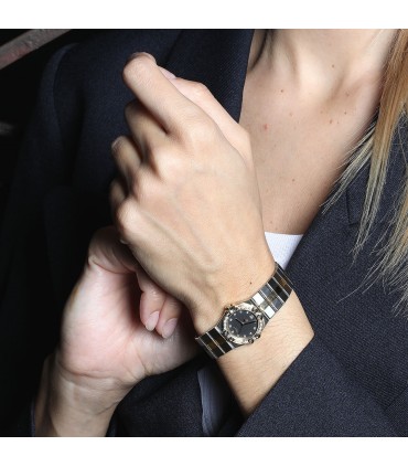 Montre bracelet de femme en or jaune et acier, cadran gris avec index et lunette diamantés, affichage de la date par guichet à 6 heures. Mouvement quartz. Bracelet articulé en or et acier avec boucle déployante. Signée et numérotée.