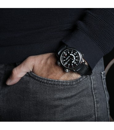 Montre bracelet d'homme en acier, cadran noir avec chiffres arabes et index luminescents, affichage de la date par guichet à 3 heures, fonction double fuseau horaire et alarme. Mouvement automatique. Bracelet caoutchouc noir avec boucle ardillon en acier. Signée et numérotée.
