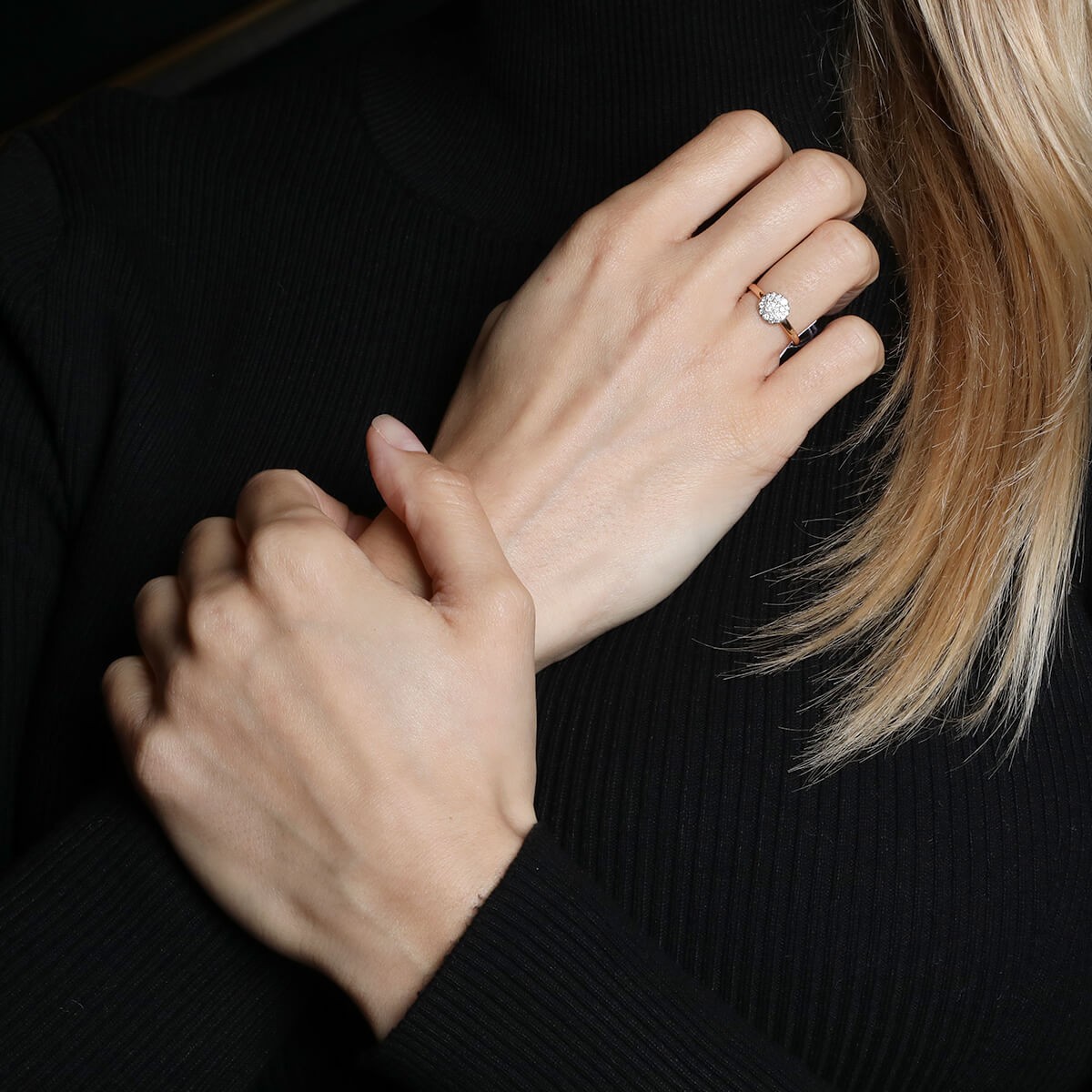 Bague en or rose, ornée d’un motif rond en or rose rhodié rehaussé d’un pavage de diamants. Signée.
