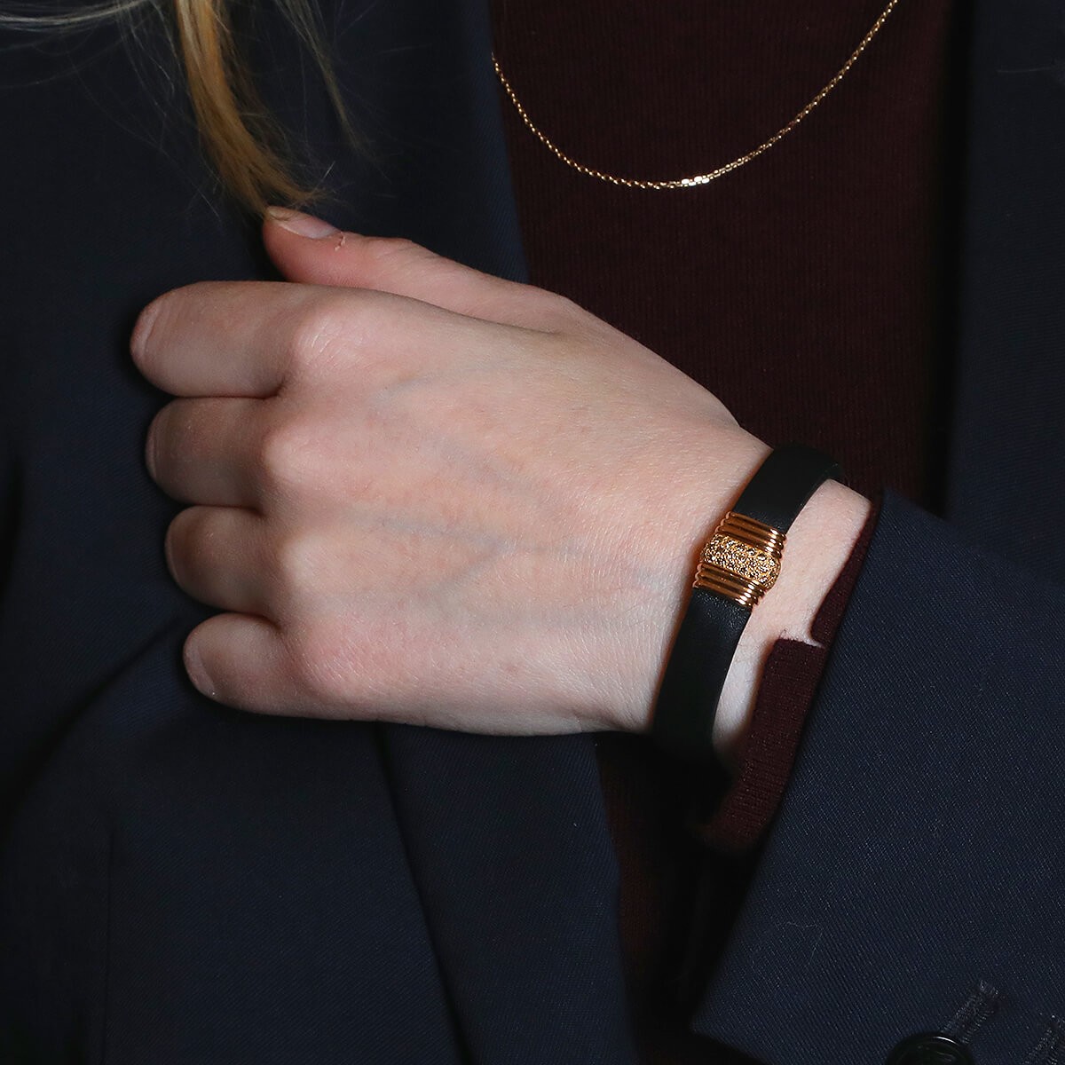 Bracelet en cuir noir agrémenté d’un fermoir en or rose orné d’un pavage de diamants couleur cognac. Signé et numéroté.