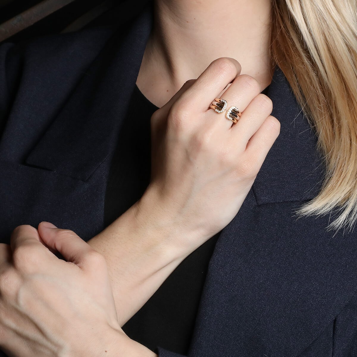 Bague ouverte 3 tons d'or, les embouts ornés du monogramme au double “C” de la maison Cartier ponctué de diamants. Signée et numérotée.