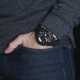 Montre chronographe en acier avec revêtement caoutchouc vulcanisé, cadran noir 2 compteurs avec index appliqués luminescents, affichage de la date par guichet à 3 heures. Mouvement automatique. Bracelet caoutchouc noir avec boucle ardillon en acier. Signée et numérotée. Série limitée à 500 exemplaires.