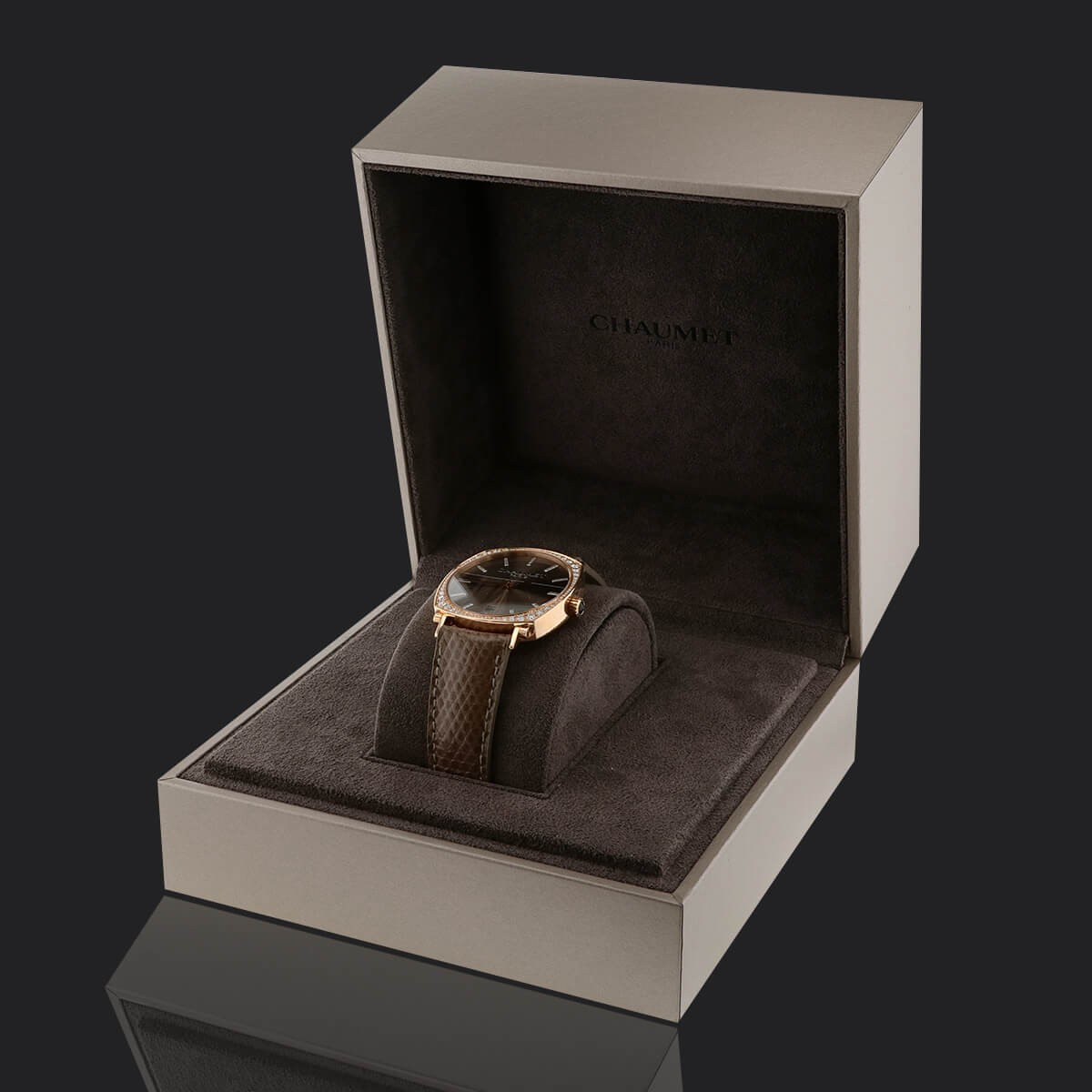 Montre bracelet de femme en or rose, cadran marron stylisé avec index diamantés, affichage de la date par guichet à 6 heures. Mouvement automatique. Bracelet en lézard marron avec boucle ardillon. Signée et numérotée.