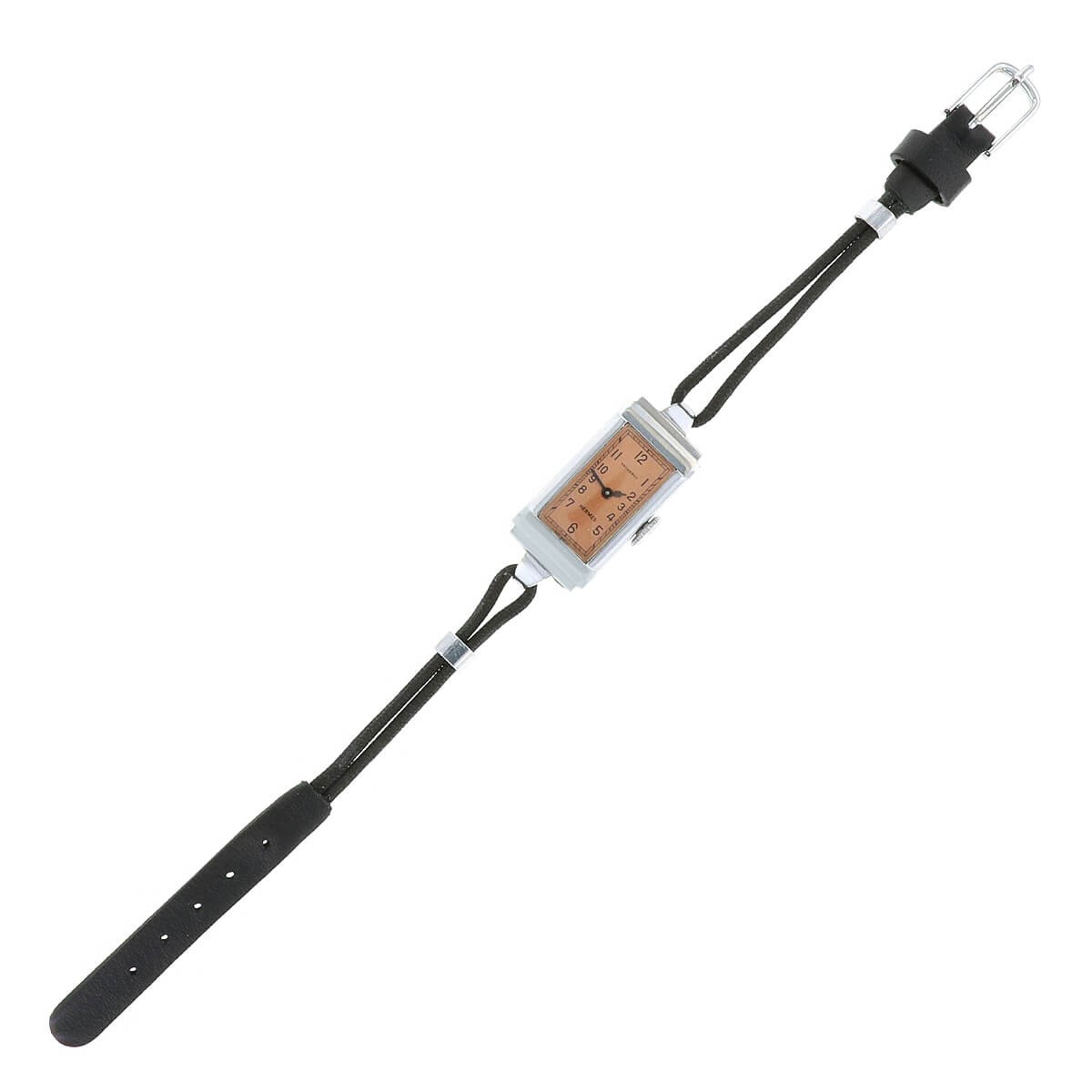 Montre bracelet de femme en acier, cadran cuivré avec chiffres arabes, chemin de fer pour les minutes. Mouvement mécanique. Bracelet en tissu et cuir noir avec boucle ardillon en acier. Signée et numrotée.