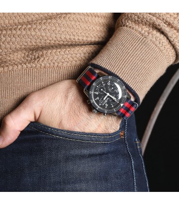 Montre Chronographe en acier, cadran noir 3 compteurs avec chiffres arabes, affichage de la date par guichet à 3 heures, lunette tournante graduée. Mouvement automatique. Bracelet nato rapporté en tissu bleu et rouge avec boucle ardillon en acier. Signée et numérotée.