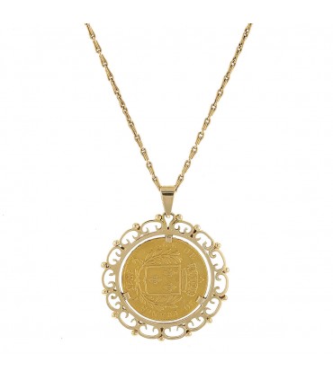 Chaîne en or jaune, maille épis, ornée d’un pendentif centré d’une pièce en or 900°/oo à l’effigie de Louis XVIII datant de 1815 dans un entourage à décor de volutes ajourées.