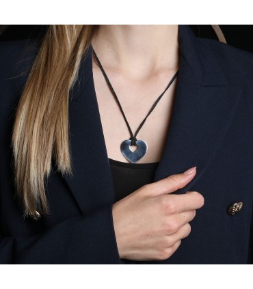 Pendentif grand modèle en argent, stylisant un coeur ajouré retenu par un cordon en tissu tressé noir se terminant par deux pompons. Signé.