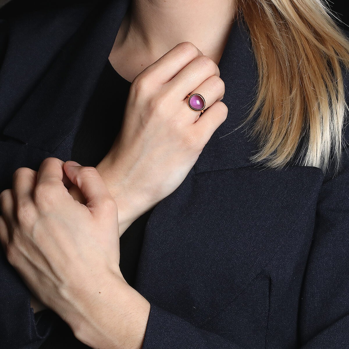 Bague en or rose, ornée d’une améthyste taille cabochon asymétrique. Signée et numérotée.