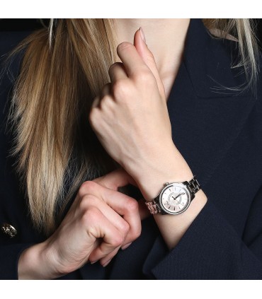 Montre bracelet de femme en acier, cadran rose rayonnant centré d’un disque de diamants avec chiffre romain et index appliqués, lunette ornée de diamants. Fond de boîte transparent dévoilant son mouvement automatique. Bracelet acier, maillons articulés stylisé avec boucle déployante en acier. Signée et numérotée.