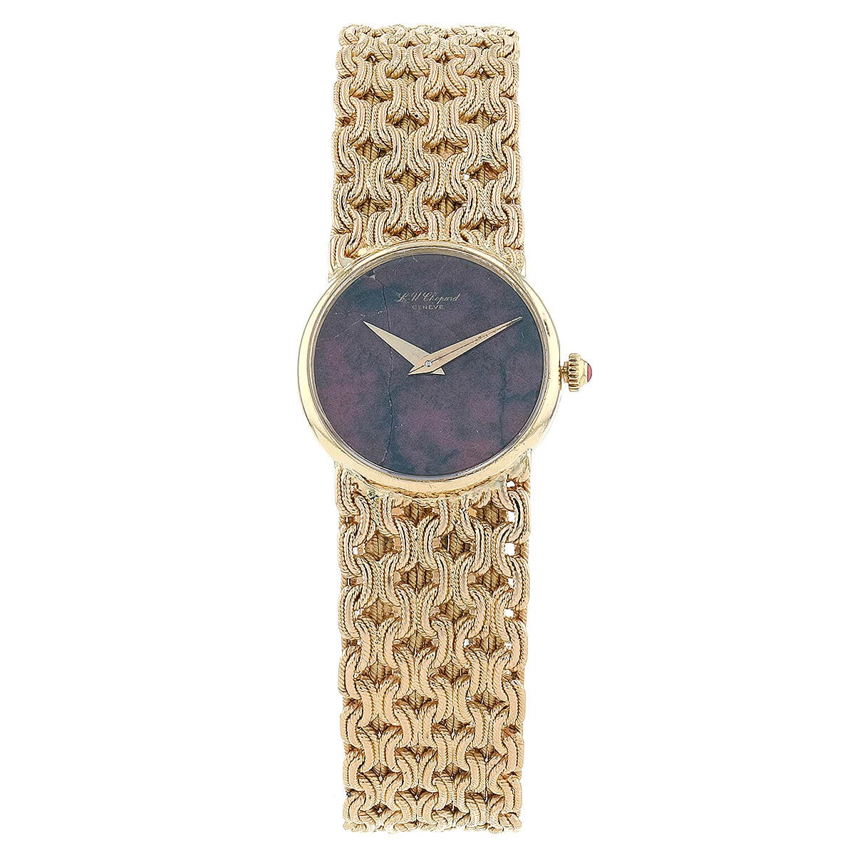 Montre bracelet de femme en or jaune, cadran muet en pierre ornementale rosé et noir. Mouvement mécanique. Bracelet en or jaune, maillons tressés agrémenté d’un fermoir invisible à cliquet. Signée et numérotée. Cadran craquelé avec un léger manque à 11h.