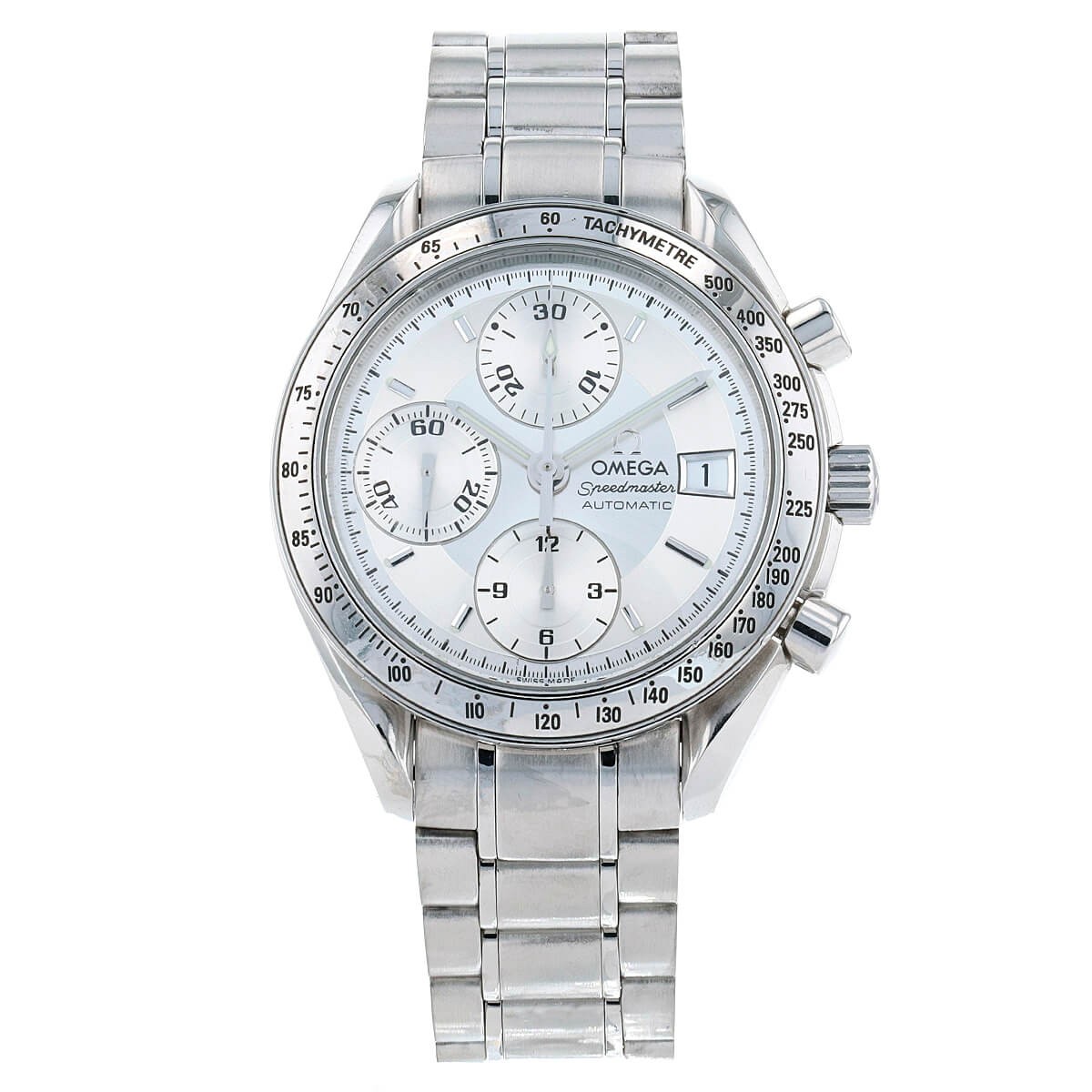 Montre chronographe en acier, cadran argenté 3 compteurs avec index appliqués, affichage de la date par guichet à 3 heures, lunette graduée d’un tachymètre jusqu’à 500 units par heure. Mouvement automatique. Bracelet acier, maillons articulés avec boucle déployante en acier. Signée et numérotée.