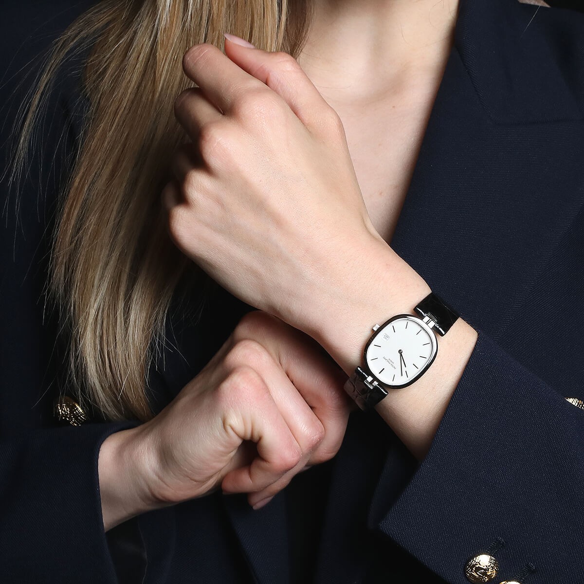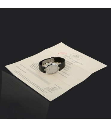 Montre bracelet en acier, cadran crème avec index appliqués. Mouvement quartz. Bracelet crocodile noir avec boucle déployante en acier. Signée et numérotée.
