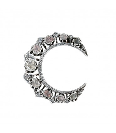 Broche en or jaune et argent, stylisant un croissant de lune ajouré orné de diamants taillés en rose.