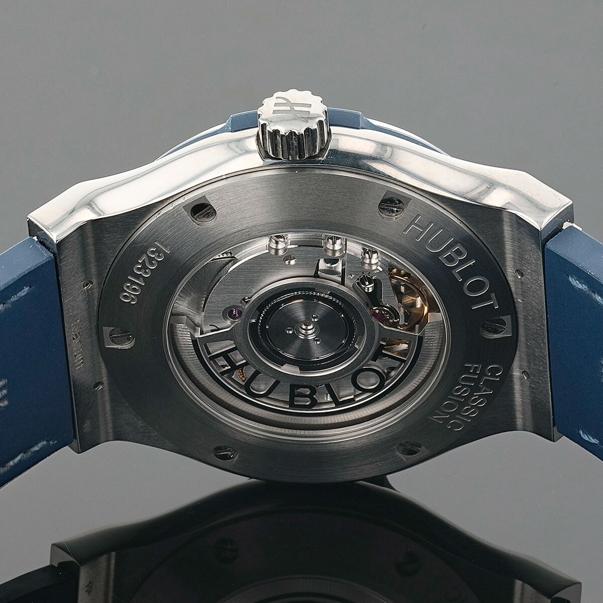 Montre bracelet d’homme en titane, cadran bleu avec index appliqués, affichage de la date par guichet à 3 heures, lunette stylisée à décor de vis. Fond de boîte transparent dévoilant son mouvement automatique. Bracelet caoutchouc bleu façon crocodile avec boucle déployante réglable. Signée et numérotée. Accompagnée de 2 bracelets supplémentaires en caoutchouc bleu.