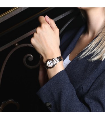 Montre bracelet de femme en or rose et acier, cadran blanc avec chiffres romains appliqués retenant 5 diamants mobiles, lunette en or rose. Mouvement quartz. Bracelet or rose et acier, maillons articulés avec boucle déployante en acier. Signée et numérotée.
